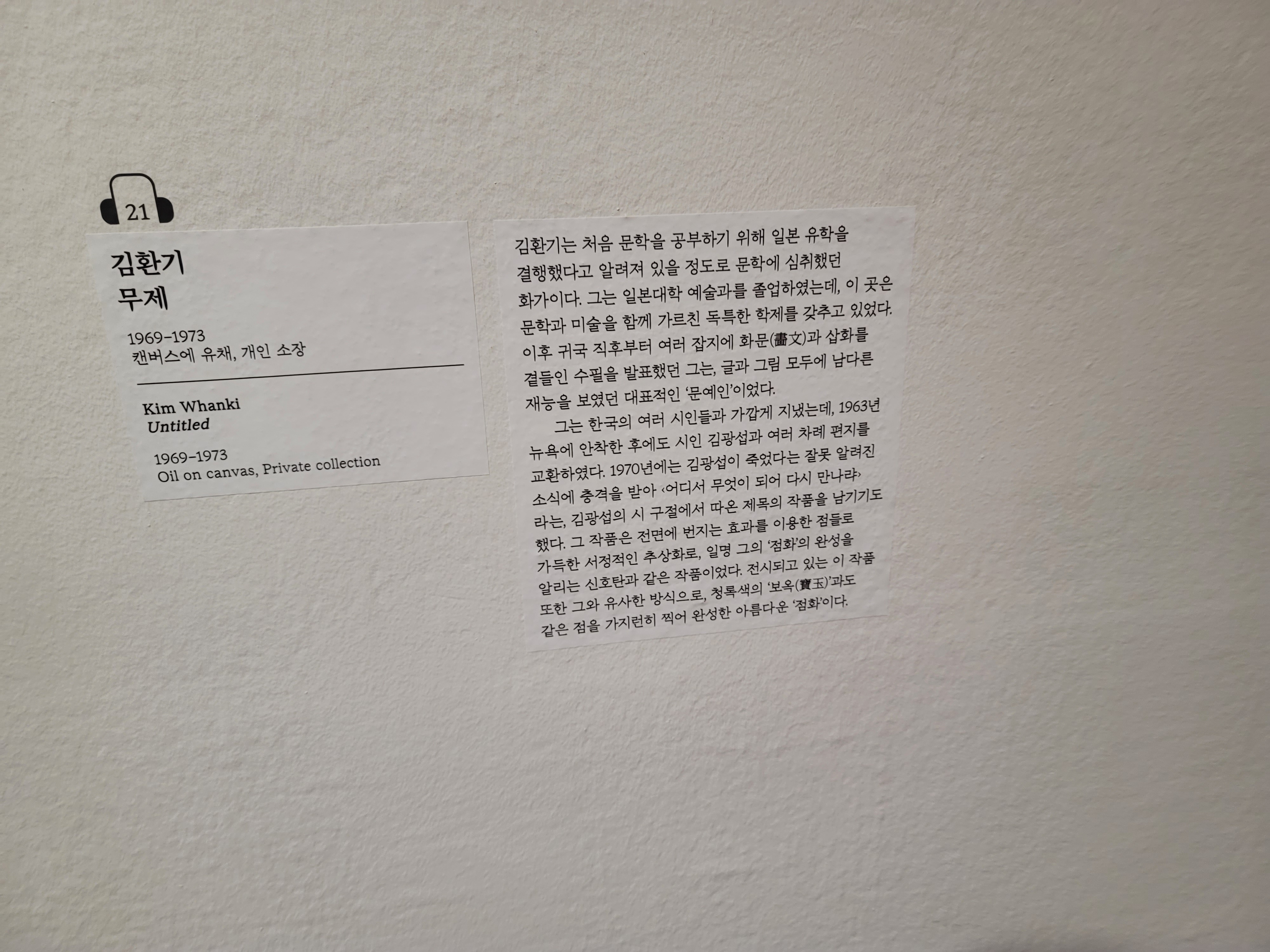 감격한 마음을 안고 환기미술관으로 자리를 옮겼다. 본관에서 김환기의 그랜드 투어 '파리통신' 전을 관람했다. 전시 촬영은 불가했다. 천천히 둘러보며 김환기 화백이 파리에서 빚어낸 심상을 독창적 조형언어와 '시정신'이라는 예술철학으로 확립하는 과정이 조금은 느껴졌고 큰 감동으로 다가왔다. 더불어 그가 이뤄낸 세계가 너무 아름다운 동시에 서글플 정도로 까마득했다. 비트라유(스테인드글라스)를 비롯해 공간 곳곳에 묻은 김향안 작가의 사랑과 그리움도 감동적이었다.